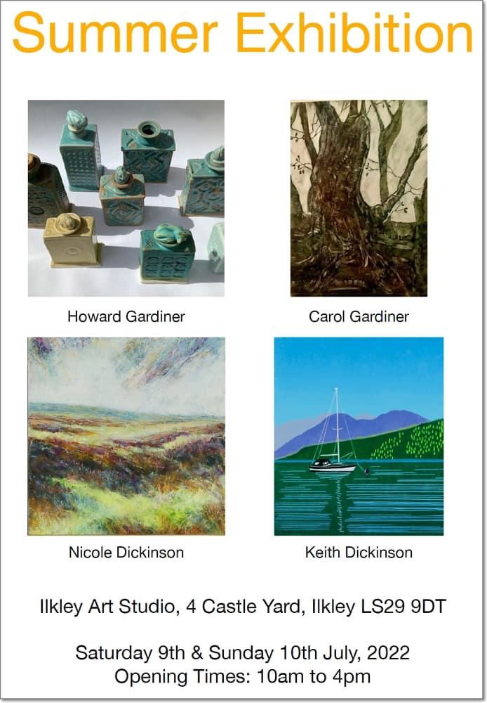 Following two successful joint exhibitions, Nicole Dickinson and Howard Gardiner have decided to exhibit together yet again and invite their respective partners (Carol Gardiner and me) to join them. The exhibition will take place over the weekend of 9th & 120th July 2022 at the Ilkley Arts Studio, Cottage nbr. 4, adjacent to the Manor House in the centre of Ilkley. Our exhibition will run during the weekend of the 9th and 10th July 2022. This promises to be a great show with paintings, ceramics and printmaking.